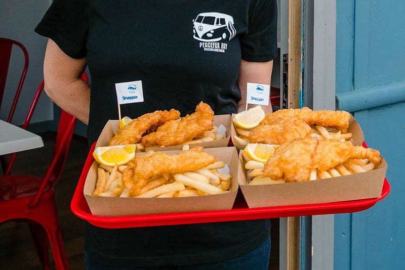 Find a seat in our café, overlooking the beautiful Peaceful Bay or grab takeaway and sit on a rock, dig your feet into the sand and enjoy the magnificent beach, either way you’ll experience the finesse and taste the freshness of deep sea fish. We use sustainable fishing methods, all our fish are caught on a line, we venture out across the ocean to bring this meal to you.